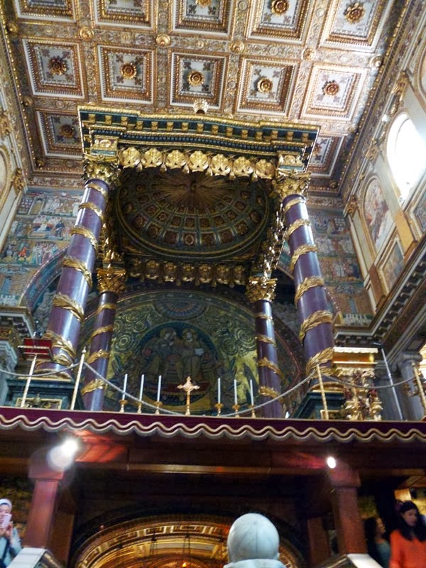 Imponente baldaquino com colunas de pórfido vermelho, decoradas por motivos floreais em bronze de Fernando Fuga. É tão grande que esconde uma parte do mosaico da abside!