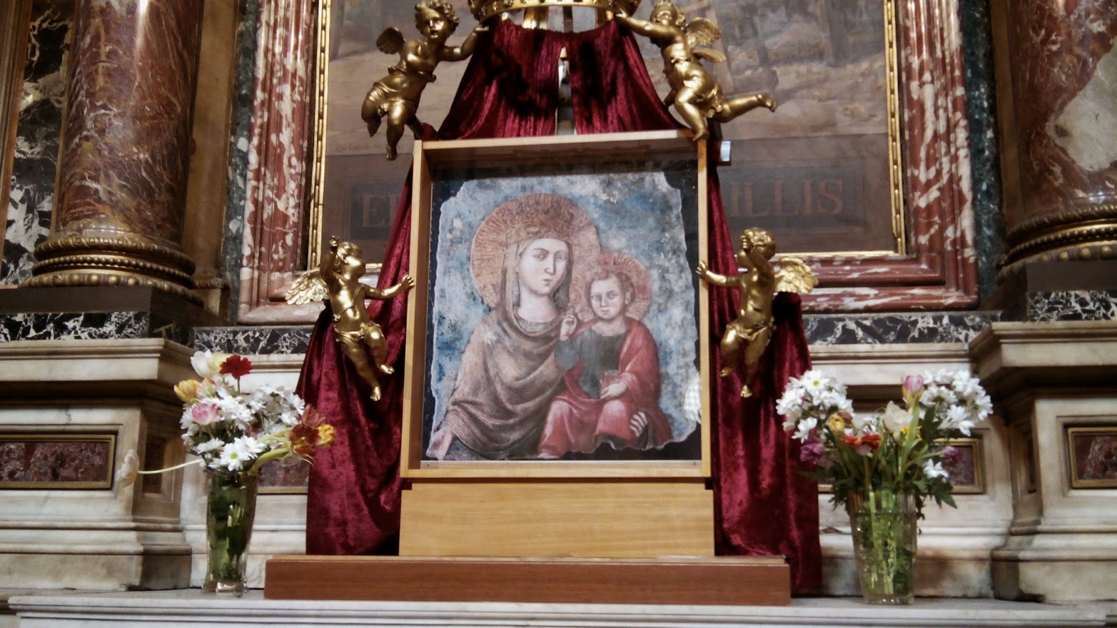 À esquerda do altar temos a capela que foi originariamente a pequena igreja “Madonna della Strada” que abrigava os fiéis antes da contrução desta igreja e que por isso se chama Capella della Madonna della Strada – Capela da Virgem da Rua; foi realizada e decorada por Giuseppe Valeriani, entre 1542 e 1596. A imagem da Virgem é um afresco do século XV da escola romana.