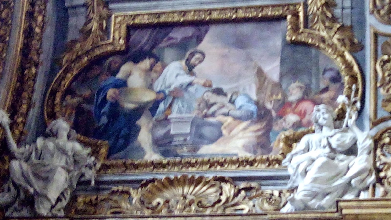 A belíssima “Circuncisão” do altar foi pintada pelo romano Alessandro Capalti em 1842. Do centro da nave central, aproveite para observar como a entrada de luz da contra-fachada ilumina o monograma de bronze “IHS” (Jesus Nosso Salvador) e é acentuado pela luminosidade que Capalti deu na sua pintura: veja como a exaltação do nome de Jesus foi realizada por estes grandes artistas: a entrada da luz (Deus, Jeovah, o ‘inominável’) ilumina o momento da circuncisão de seu filho, Jesus.