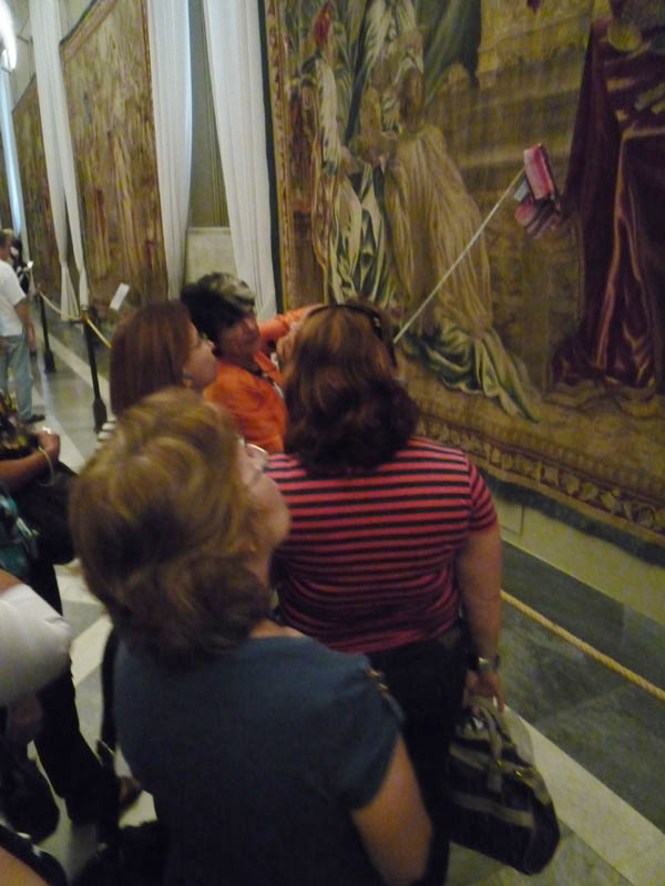 Depois passamos pela galeria dos tapetes (“arazzi” em italiano) que foram feitos baseados em desenhos de Raffaelo, que por sua vez foram produzidos em maneira exímia em Bruxelas. Luisa nos mostra mágicas perspectivas e temas bíblicos representados.
