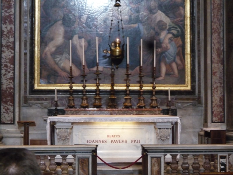 Saímos de lá por uma porta reservada aos guias oficiais da cidade de Roma, para nos encontrar já dentro da Basílica de São Pedro (pulando a fila!), onde começamos a nossa visita tentando “entender” as dimensões gigantescas da maior igreja do mundo! Logo à direita, vemos a Pietà do Michelangelo e depois, a tumba de Papa João Paulo II, que estava antes nas “grutas vaticanas” (o primeiro subsolo da igreja), mas que depois da beatificação do Papa, adquiriu um lugar no interno da basílica.