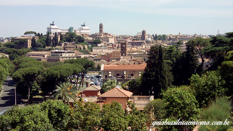 Do alto do punto panorâmico vemos um trecho de Têvere, o Garibaldi no alto do Gianícolo, as costas do Altar da Pátria… e se preocurarmos bem, muito mais!