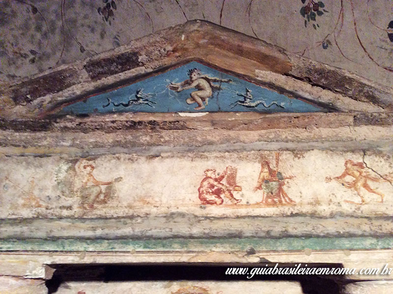 Cavado na rocha vulcânica, foram realizados estruturas que assemelham “pequenos templos”, com lugar para a deposição dos vasos com as cinzas dos defuntos. Tímpano sobre colunas ( a mais importante delas em estilo dórico, pouco comum em Roma) sobre a qual foram aplicadas figuras em gesso que contam mitos de Dionísio; nas figuras antopomorfas da sepultura principal, que não foram identificadas e são lindas, vemos duas figuras femininas correndo nas extremidades da direita e da esquerda, com uma cena de duas pessoas que parecem tocar algum instrumento no centro – tudo muito de acordo com o resto da decoração que tem como tema principal o Dionísio, deus do êxtase, do vinho, da energia vital impregnada em toda forma de vida – aliás, estas figuras representam uma visão da morte no I século d.C., que é quase comparável à visão cristã do Paraíso, do “estar bem no além”.