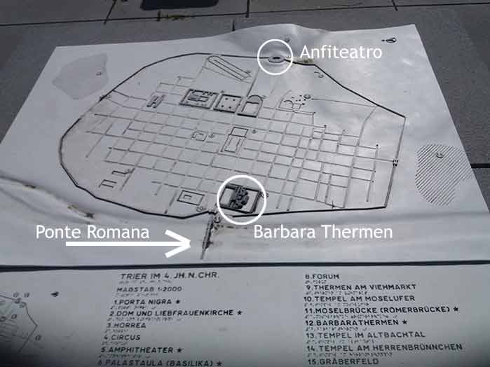 Existem duas termas antigas , um portão de muro do II séc. d.C., uma basílica do IV século (razão pela qual decidi fazer esta viagem) e um pequeno anfiteatro. O Landesmuseum Trier tem salas dedicadas à geologia do território, objetos dos Celtas, decorações prestigiosas romanas, objetos e sarcófagos romanos enormes – como nunca tinha visto. Uma catedral do IV século construída sobre ruínas de uma domus romana, uma igreja medieval de São Maxim e uma igreja barroca (São Paulino).