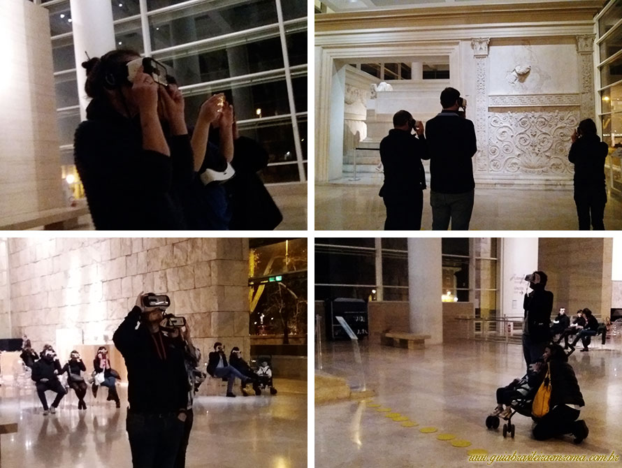 Com a ajuda dos fantásticos óculos 3D (e eu não sou chegada em muita tecnologia!), podemos ver a reconstrução da área do Campo Marzio, onde a Ara Pacis foi construída e uma voz nos conta a história da iconografia representada nas suas paredes exteriores. Realmente fiquei besta de poder me virar na sala do museu e encontrar-me circundada pela vegetação e como parte integrante do sacrifício realizado. É um programão para quem quer aprofundar um pouquinho da experiência em Roma, ou é apaixonado por tecnologia para vê-la aplicada magistralmente.